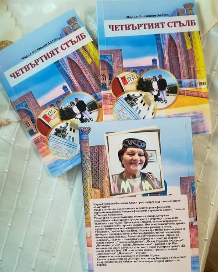 Сегодня вышла в свет роман «Четвертый столб» посвященной Узбекистану известной болгарской писательницы Марии Филиповой-Хаджи на болгарском языке. Книга была печатана в издательстве «ИМЕОН» в историческом городе Пловдив в Болгарии.