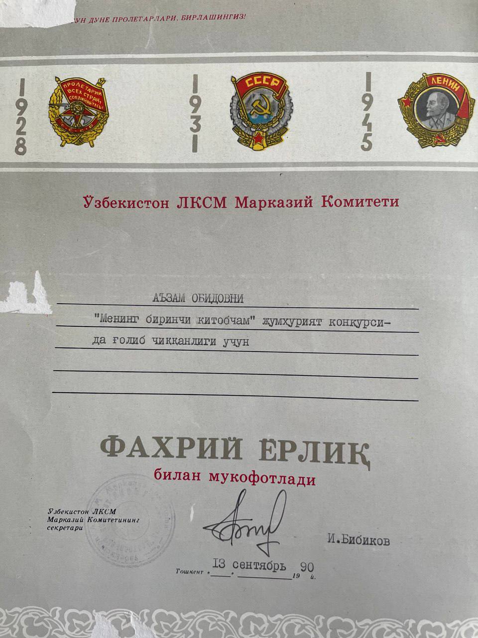 Республика танловида ғолиб бўлганимда менга Тошкентга путёвка, кино қўядиган ускуна ва мана бу ёрлиқни беришган.