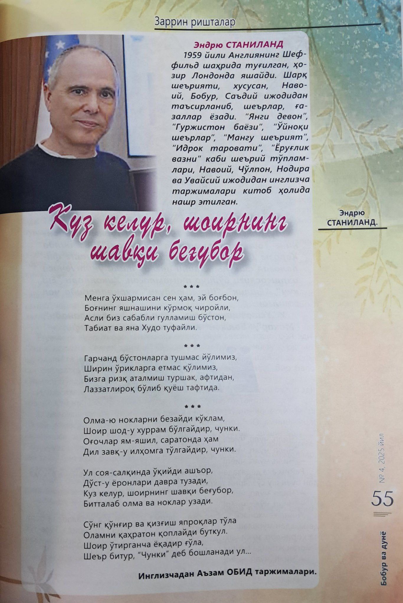 “Бобур ва дунё” журналида Эндрюдан таржимам Azam Abidov 18.01.2026 Адабиёт янгиликлари, Ижодкорлар учун ресурслар, Таржималар